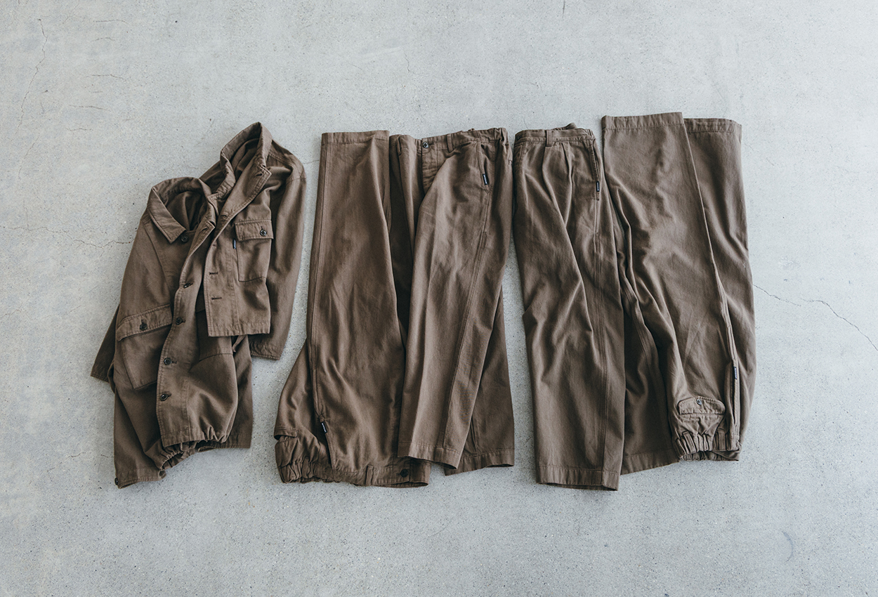 今シーズンも、チノシリーズのバックボーンにある「ミリタリー」に引き続き着目。軍物のヴィンテージをヒントに、黄色味を抑えたシックなブラウンとなるよう、岡山・児島の染工場に染め上げていただきました。