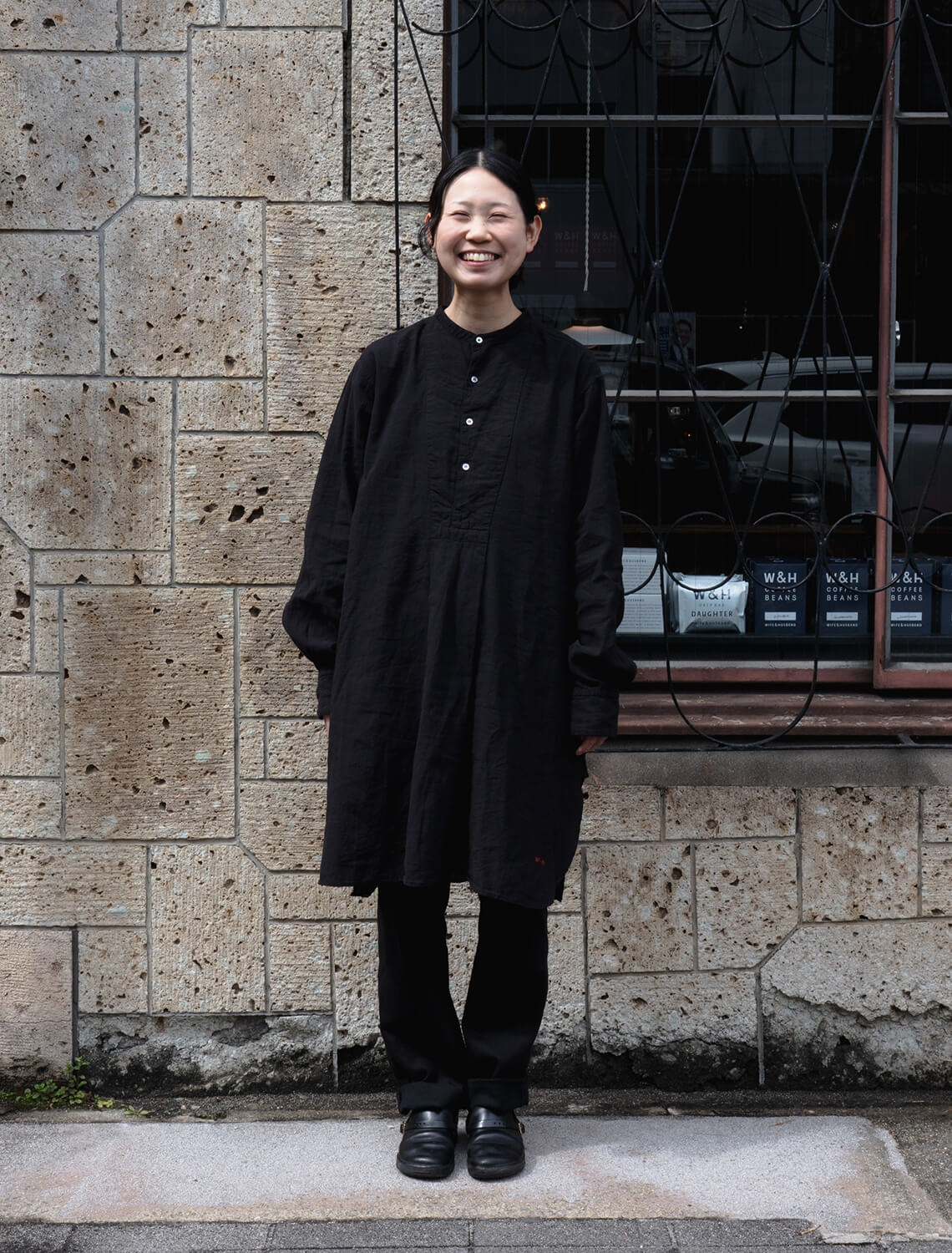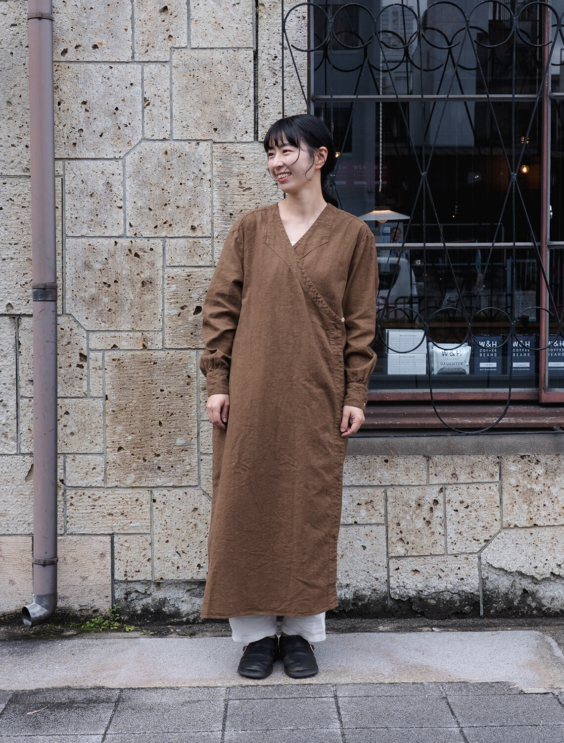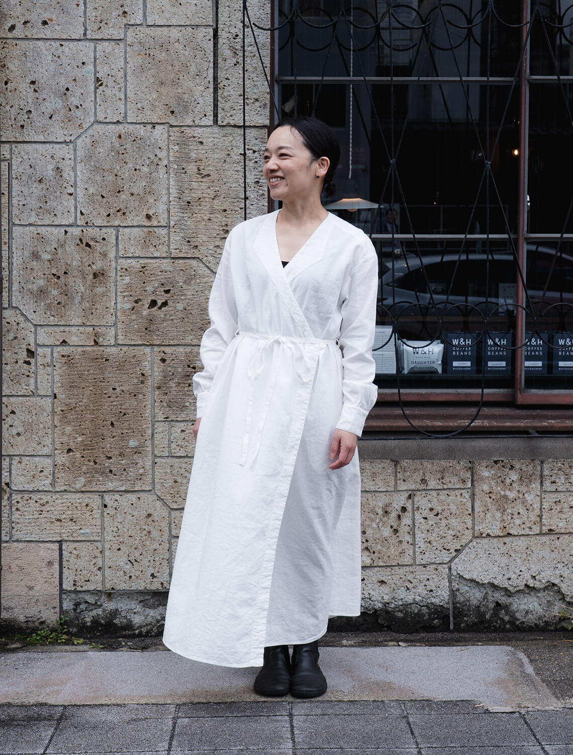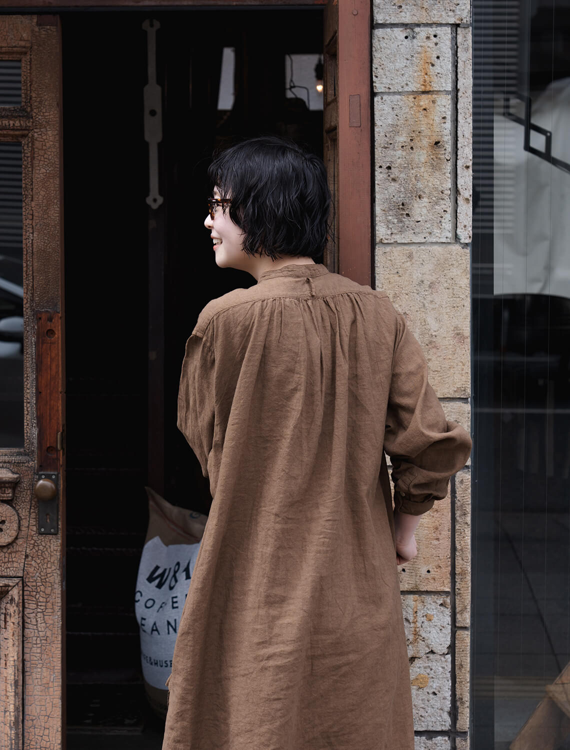 分量感のあるシルエットと、風をはらむ軽やかさが魅力です。一枚でさらりと着ても、重ねても様になり、動きに合わせてやわらかな表情を生むワンピースです。