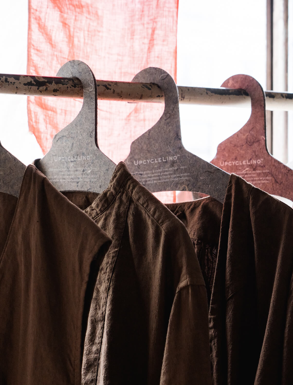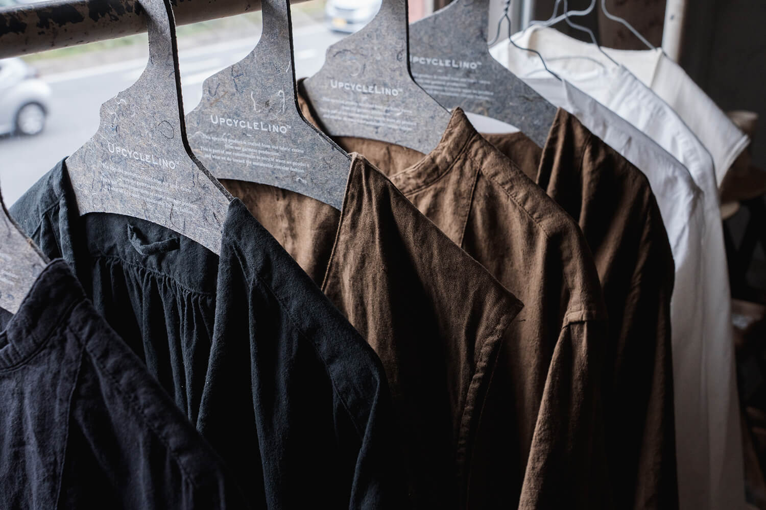 UpcycleLinoプロジェクトから生まれた素材を使用した3アイテム。それぞれの素材が持つ軽さと柔らかさを活かした、着るほどに体に馴染んでいく日常着を作りました。