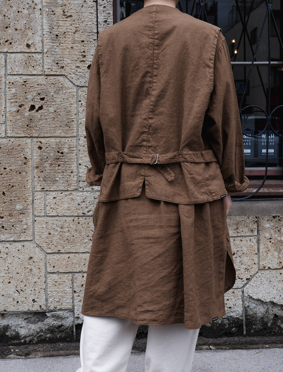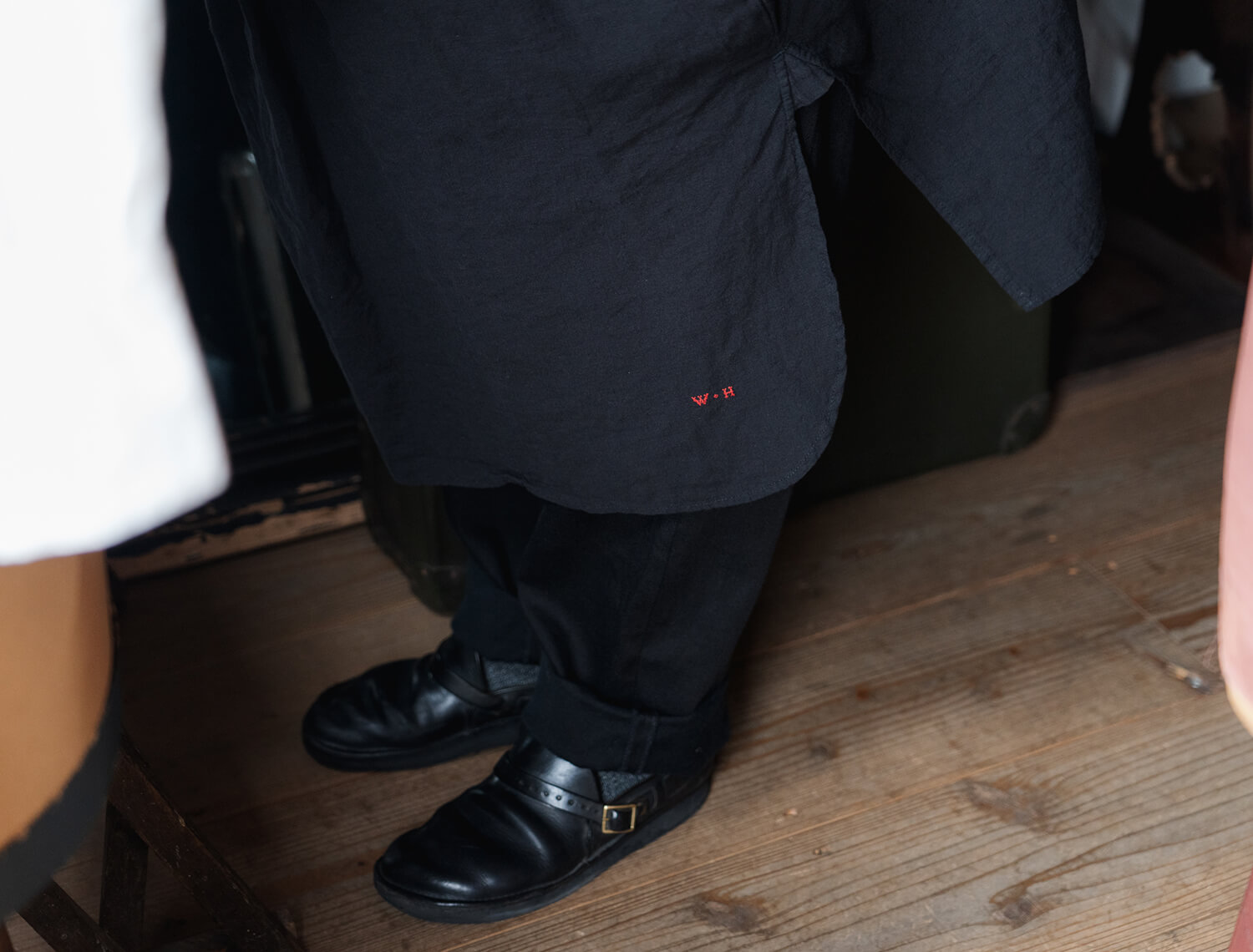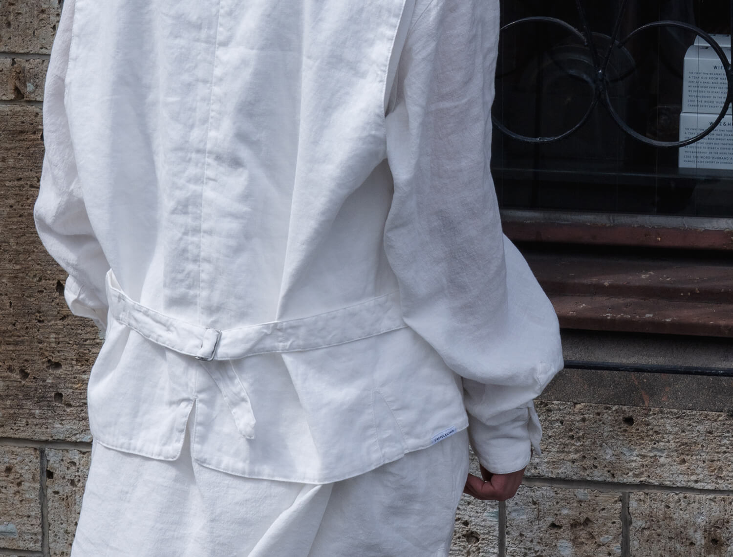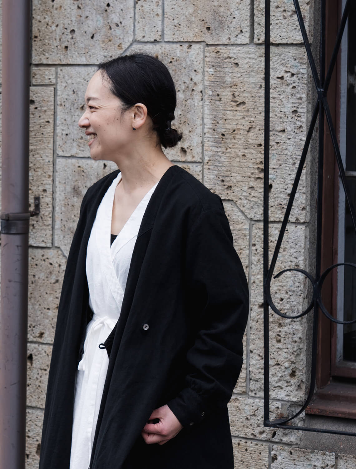 吉田さんご夫婦が愛用するヴィンテージウェアをモチーフとして、現代のライフスタイルに寄り添うアイテムになるようデザインをブラッシュアップ。UpcycleLinoプロジェクトから生まれた生地を用いてエシカルで心地よい日常着をおつくりしました。